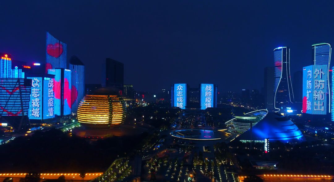 杭州市综合行政执法局积极协调钱江新城管委会在钱江新城建筑群上展示公益标语,为防疫战疫凝聚人心。