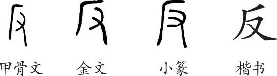 “反”是会意字。甲骨文从又,从厂(山崖),会以手推转山石之意。金文大致相同,小篆整齐化。隶变后楷书写作“反”。