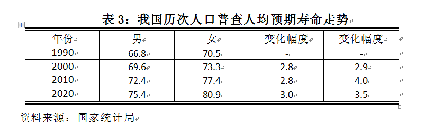 改革开放以来,随着人民生活水平的提高,我国人均预期寿命保持了稳步上涨的态势。第七次人口普查显示,我国男性和女性的人均预期寿命为75.4岁、80.9岁,较第六次人口普查分别提高了3岁、3.5岁;较第四次人口普查分别提高了8.5岁、10.4岁。联合国人口司对于我国人均预期寿命的预测延续了这一趋势,具体来看,2100年我国男性人均预期寿命由2022年的76.0岁上升到88.6岁,增加了12.7岁;女性人均预期寿命由2022年的81.3岁上升至91.9岁,增加了10.5岁。