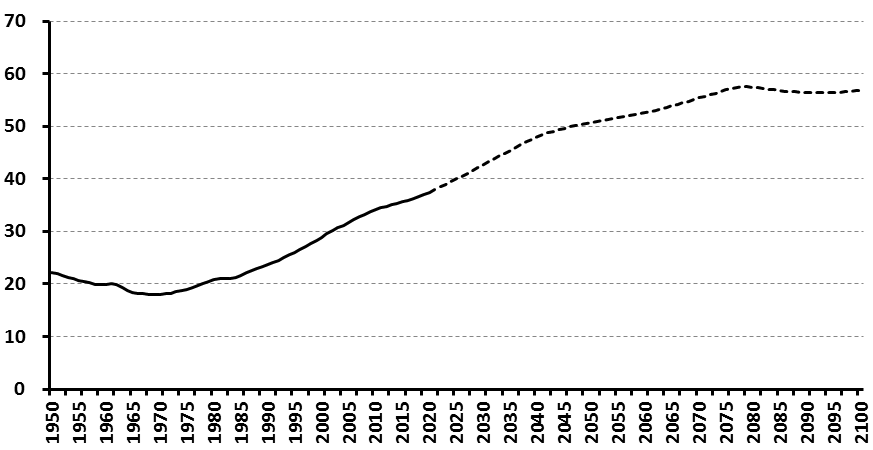 受出生人口减少和人均预期寿命增加等因素影响,我国人口老龄化程度将逐步加深。根据联合国人口司的预测,中情景下,我国人口老龄化在未来相当长时间内保持稳步上升的态势。具体来看,我国居民中位数年龄将由2022年的38.5岁逐渐提升至2078年的57.5岁,之后将稳定在这一水平上持续至2100年。老龄化程度的不断提升将对我国人口均衡发展带来重大影响。