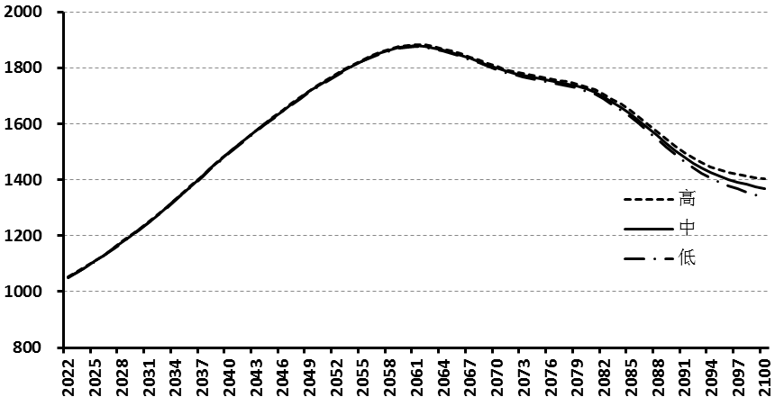 根据联合国人口司的预测,高中低三种情景下,我国死亡人口的数量均经历先升后降的过程。具体来看,三种情景下,我国死亡人口由20221050万左右逐步提高,到2060年左右达到峰值约1680万左右,随后进入下降阶段。与前一阶段不同,受新出生人口数量差异性开始显现的影响,2060年后三种情景下的我国死亡人口数量有所发散,预计到2100年,高中低三种情景下的死亡人口分别降至1403万、1369万、1336万,高情景和低情景的差距升至67万人。