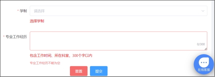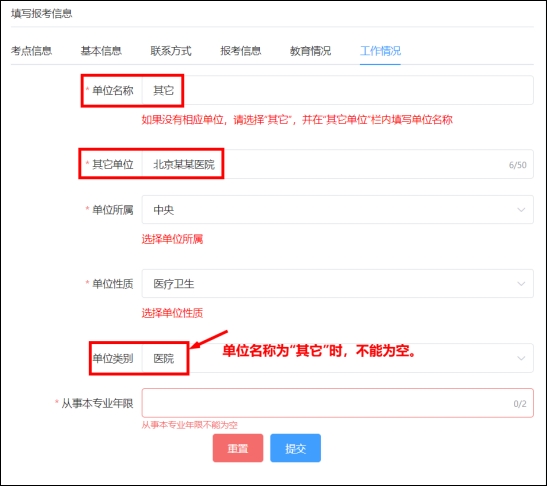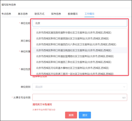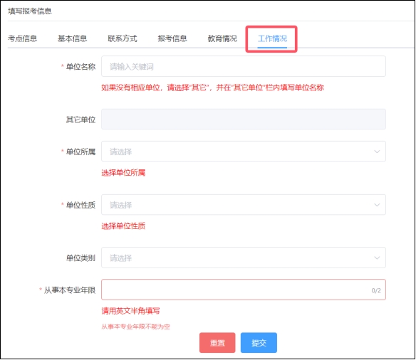 (6)填写工作情况,包括“单位名称”、“单位所属”、“单位性质”、“单位类别”和“从事本专业年限”。