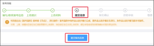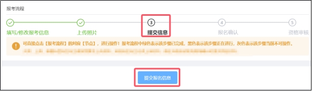 (8)上传照片后系统将跳转至【提交报名信息】页,考生也可点击【报考流程】中的“提交信息”节点,确认无误后点击“提交报名信息”。