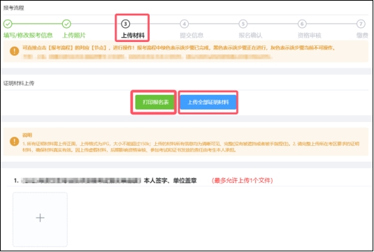 报考信息填写完成后,系统将跳转至【上传材料】页,考生也可点击报考流程中的【上传材料】节点进入上传材料页面。考生可先点击“打印报名表”,下载并打印报名申请表,然后按照考区的要求上传相关证明材料。