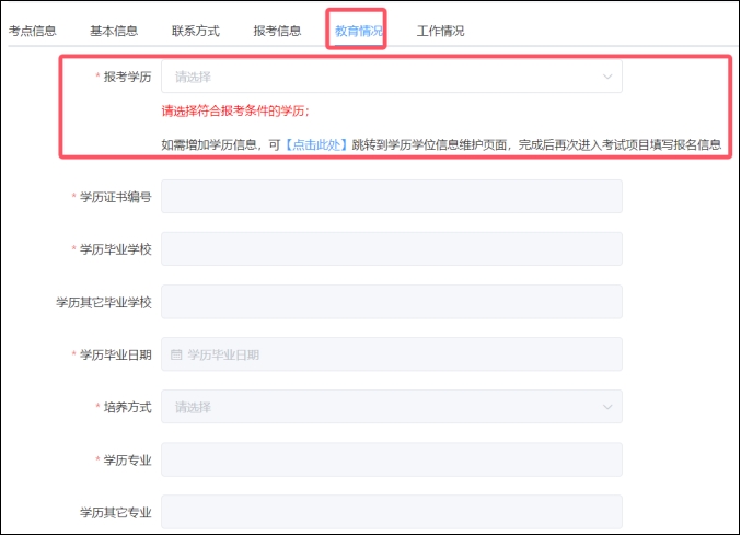 (5)报考学历和学位相关信息下拉选择,引用基本信息中【学历学位信息维护】的内容。如需修改,请在学历学位信息维护页面进行操作,完成后再次进入考试项目填写报考信息,引用正确的学历和学位信息。
