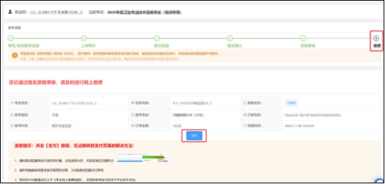 点击报考流程中的【缴费】节点,核对报考专业科目和金额,确认无误后,点击“支付”按钮跳转至考区指定的缴费平台进行支付。完成缴费后【缴费】节点变为绿色,表示报名成功。