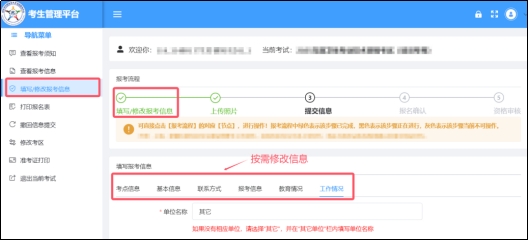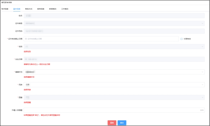 进入填写报考信息页面,系统将默认显示上一年度的报名信息。考生须逐页核对基本信息、联系方式、报考信息、教育情况、工作情况,可根据本年度报名的实际情况修改,确认无误后点击提交。
