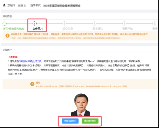 (7)以上信息提交后,系统会自动跳转至上传照片页面,也可点击【报考流程】中的“上传照片”节点,进入功能区上传照片。默认引用注册照片,如无需修改,点击“确认使用照片”;如需更换照片,下载照片审核处理工具对新照片处理后点击“更换考试照片”,选择处理后的新照片即可。