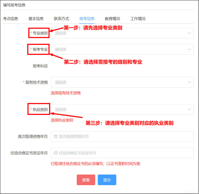 考生须根据所选的专业类别,勾选对应的执业类别,执业类别不为“无”时,首次注册年月不能为空。