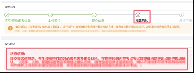 提交报名信息后,考生须按照当地考试管理机构的要求,在规定的时间内,携带报名表和相关材料前往指定地点进行报名确认。经报名点或考点确认报名信息后,“报名确认”节点变为绿色。
