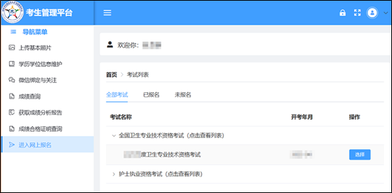 1.点击【进入网上报名】,选择“xxxx年度卫生专业技术资格考试”。