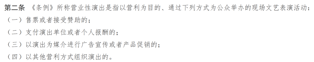 在这张节目单上,我们看到了绿城沁香园的这次活动聘请了多家专业演出团队,根据《营业性演出管理条例实施细则》第二条的界定,属于营业性演出。