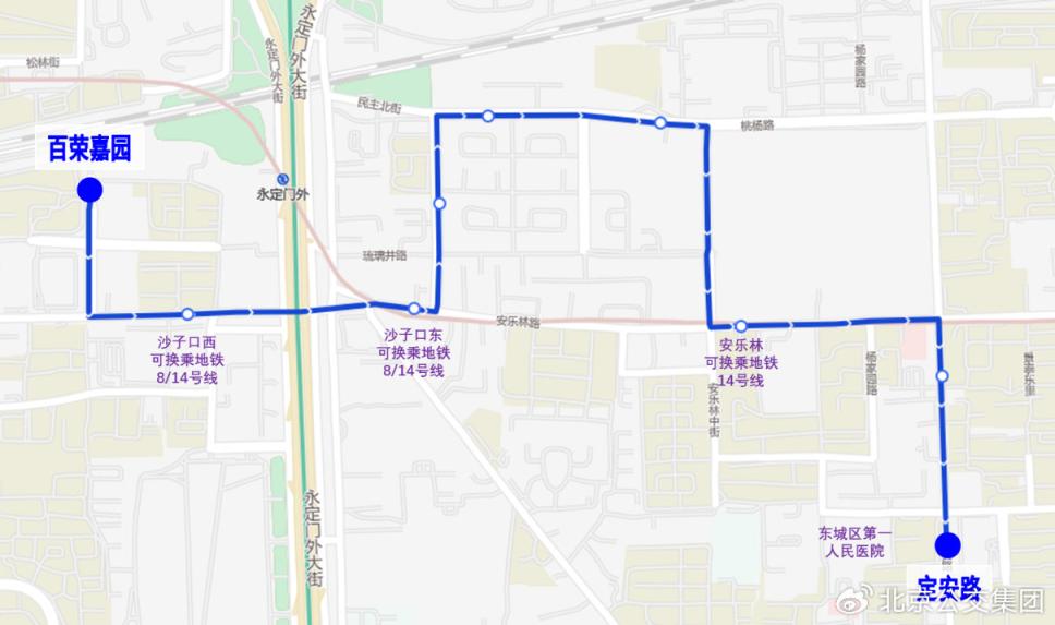 乘客可在“沙子口西”“沙子口东”站接驳地铁8号线、14号线永定门外站,在“安乐林”站接驳地铁14号线景泰站,在“定安路”站接驳东城区第一人民医院。
