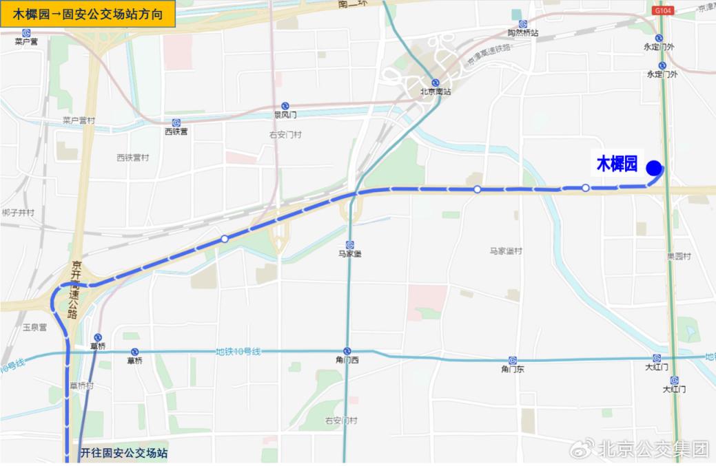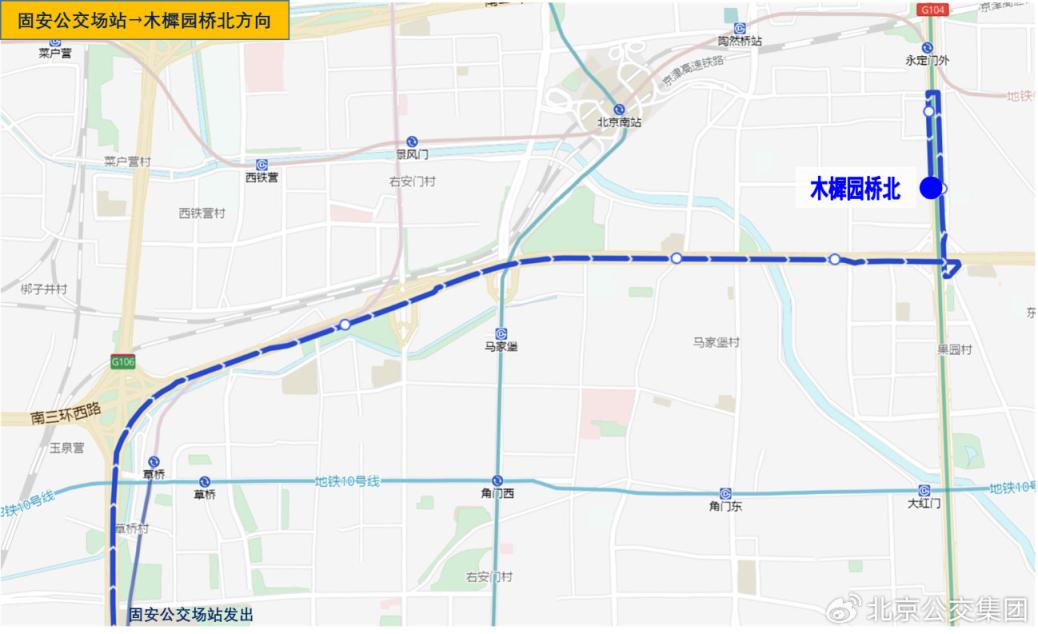 由固安公交场站发出方向,增设“福海路西口”站及“木樨园桥北”南行站,取消“永定门汽车站”站,“沙子口”站移至永定门外大街西侧;