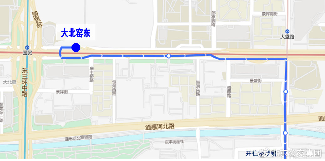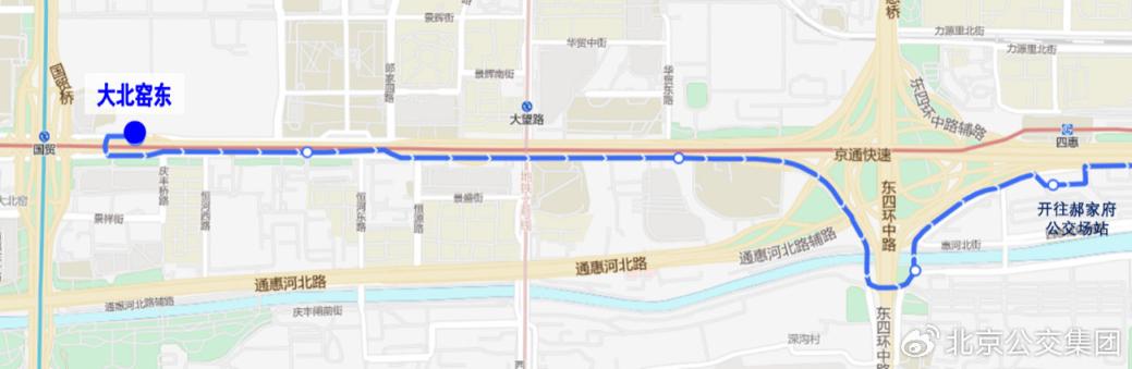 郝家府公交场站→大北窑东方向路由、设站不变;大北窑东→郝家府公交场站方向“大北窑东”上车站调至建国路北侧(与“大北窑东”下车站同站位),同时“玉桥中路”站移至乔庄北街,站名调整为“乔庄北街西口”。