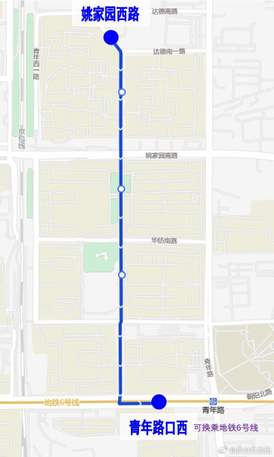 沿途设站:姚家园西路、国美家园社区、华纺易城社区、润枫水尚小区、青年路口西。