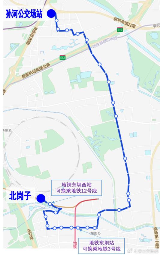 乘客可在“地铁东坝西站”换乘地铁12号线前往三元桥及北三环路沿线。京密路沿线前往北三环路的乘客可改乘641路。