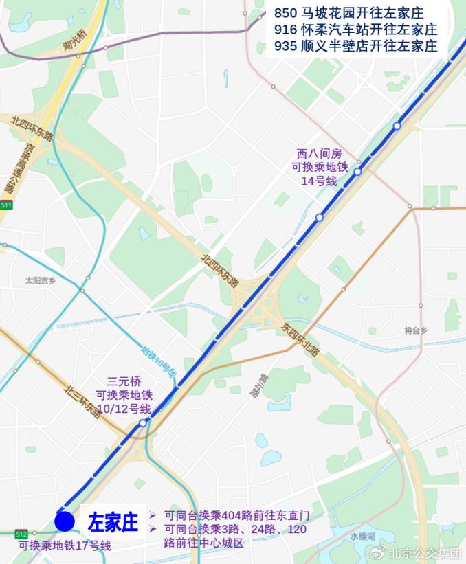 沿线乘客可在“西八间房”站换乘地铁14号线,在“三元桥”站换乘地铁10号线、12号线,在“左家庄”站换乘地铁17号线。乘客也可在调整后的“左家庄”站同台换乘404路前往东直门,同台换乘3路、24路、120路等线路前往中心城区。