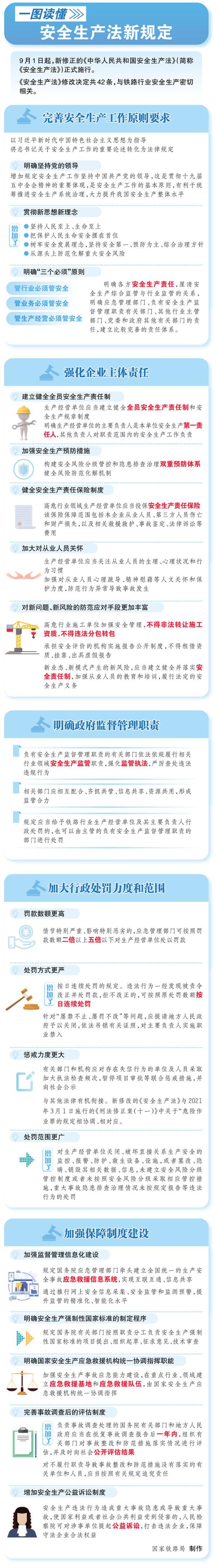 9月1日起,新修正的《中华人民共和国安全生产法》(简称《安全生产法》)正式施行。《安全生产法》修改决定共42条,与铁路行业生产密切相关。到底该如何解读?国家铁路局带您一图读懂《安全生产法》新规定↓