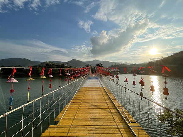 新丰旅游度假村,依山傍水,生态环境优越,空气清新宜人,设施齐全,服务细致周到,是远离都市喧嚣、回归自然怀抱的理想胜地。蜿蜒的驮娘江穿村而过,巧妙地将村庄划分为两区四组两半岛,设有三个游览区,并通过两座别具一格的吊桥相连。新丰水电站的落成,在高峡之间营造出一片宁静的平湖,高耸的青山与辽阔的湖面交相辉映,使新丰村宛如镶嵌在一幅绝美的山水画卷中,吸引了众多摄影爱好者纷至沓来。