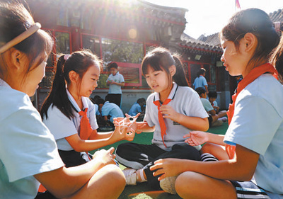 北京市东城区黑芝麻胡同小学“课间一刻钟”,学生们在做游戏。黄 超 郭 谦摄影报道