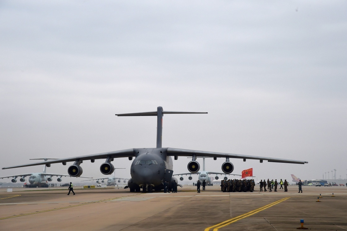 空军出动3型11架运输机多地同步向武汉空运医疗队员(2020年2月13日摄)。新华社记者 黎云 摄