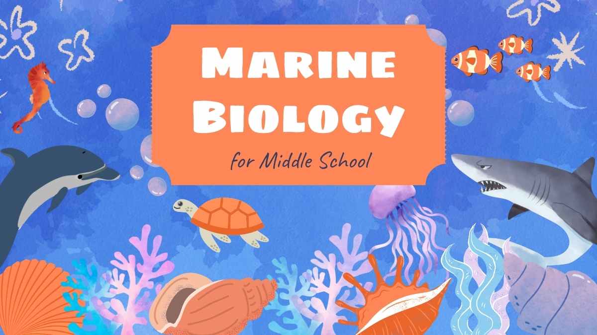 This marine biology PowerPoint template blends a playful and educational style, featuring a vibrant underwater world with hand-drawn sea creatures and coral. The mix of bold typography and watercolor textures makes it engaging for middle school lessons while keeping it fun and visually appealing.