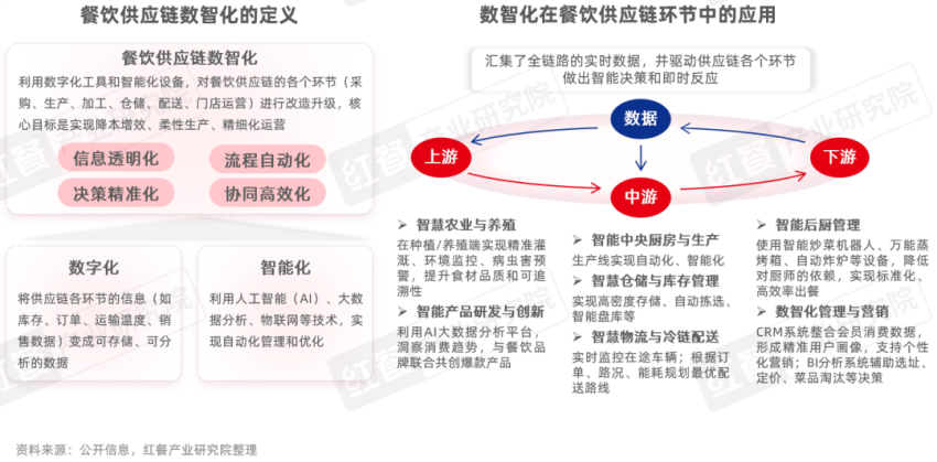 当下,餐饮供应链正加速向数智化方向演进,数智化已深入到餐饮供应链的研发、生产、物流、管理等各个环节,通过搭建数字化平台、应用数智化技术,并依托大数据,最终为餐饮客户提供更高效、更稳定、更精准的产品与服务,赋能下游餐饮品牌。