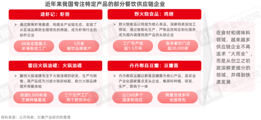 例如,食材领域和调味料领域的虾滑、鸡翅、乌鸡卷、肥牛卷、火锅油碟、豆瓣酱等均已出现了一批专业化企业,成为许多知名餐饮品牌的合作对象。