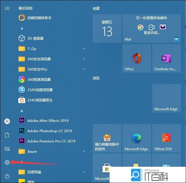 1、首先,按Win键,或点击左下角的开始,在打开的菜单中,点击电源按钮上方的设置;