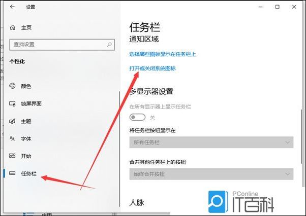 3、个性化主页设置窗口,左侧点击任务栏,右侧点击打开或关闭系统图标;