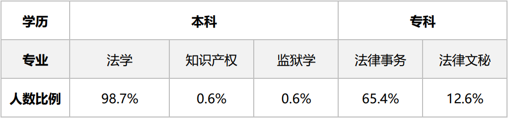 在学信网学职平台的职业调查中,有4.2万人毕业于法学类专业。学历分布为专科毕业生占比20.4%,本科毕业生占比65%,研究生毕业生(包含硕士、博士)占比14.6%。各学历层次毕业人数较多的部分专业和相对应的人数比例如表2、表3所示。