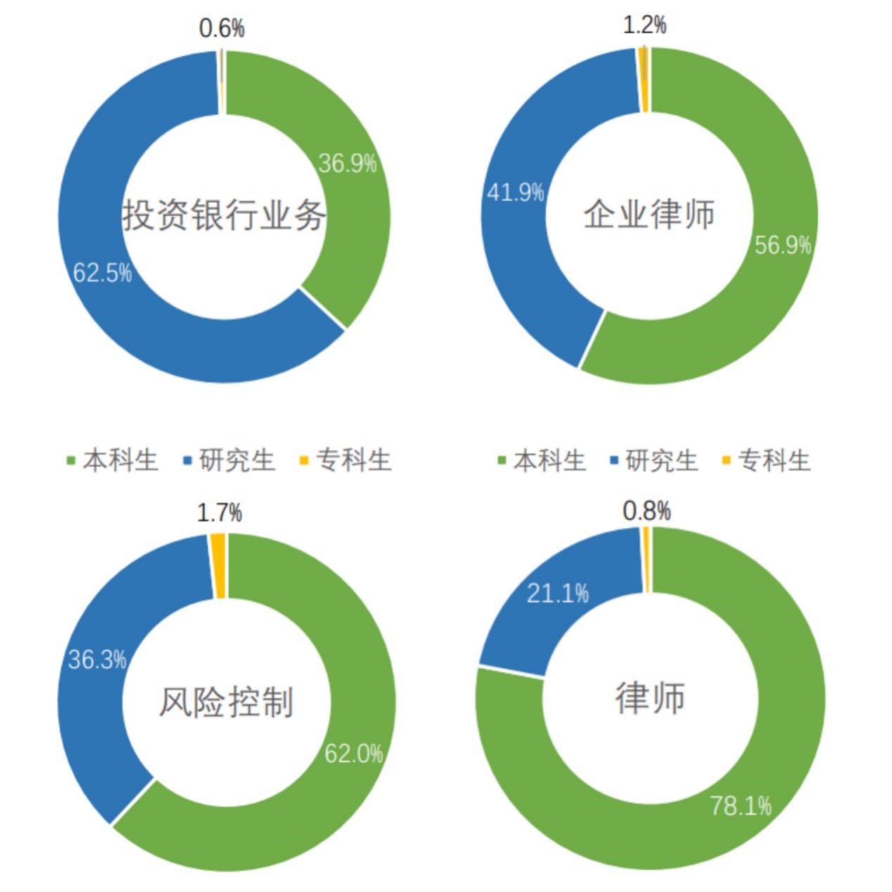 然而,高薪工作对从业者有一定的要求,往往需要个人有丰富的专业知识背景、相应的从业资格证书,以及满足一定的学历要求。如图5所示,法学类人才毕业4年后平均月薪最高的投资银行业务岗位研究生占比达到62.5%,本科生占比36.9%,专科生比例仅为0.6%。