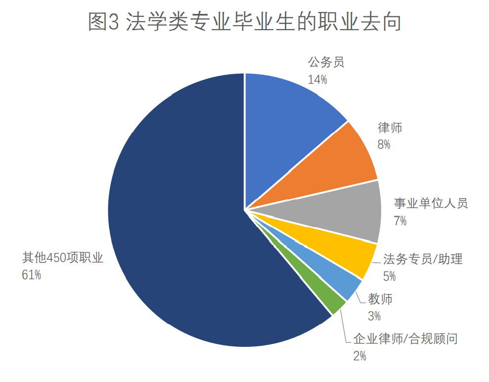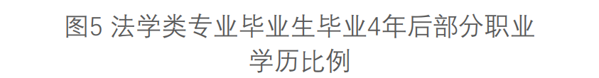 同时,法学类专业毕业生就业行业及企业类型分布情况使其在职业去向上表现为就业结构“特色鲜明”——以公务员、律师、事业单位等现代服务业为主(图3所示)。同时教育领域也是法学类人才倾向于选择的就业方向。