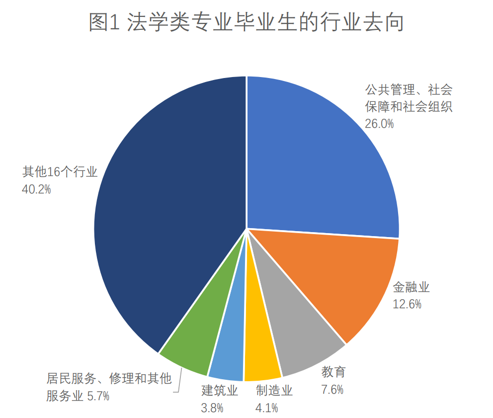 从就业行业分布来看(图1所示),法学类专业毕业生倾向于专业较对口的行业就业,其中公共管理、社会保障和社会组织、金融业是法学类人才主要的行业流向。