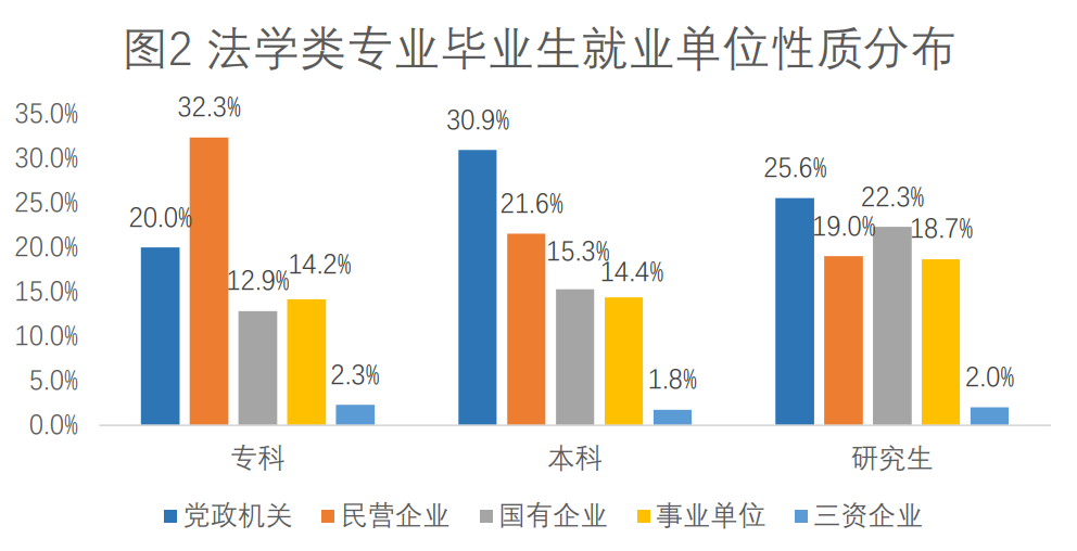 综合各学历层次毕业生就业的企业类型来看(图2所示),法学类人才就业单位性质多元。专科毕业生以民营企业为主;本科生在党政机关和民营企业就业比例最高,共计占比52.5%;研究生就业平均分布在党政机关、民营企业、国有企业、事业单位中。