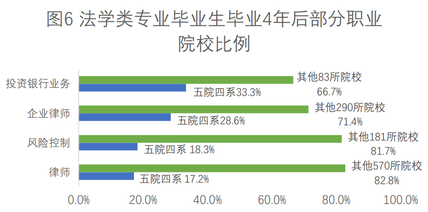 此外,院校背景情况也是从事高薪职业的重要影响因素(图6所示),学信网学职平台调查显示,在投资银行业务、企业律师、律师和风险控制岗位中,五院四系(中国政法大学、西南政法大学、西北政法大学、中南财经政法大学、华东政法大学、北京大学法学院、中国人民大学法学院、吉林大学法学院、武汉大学法学院)的毕业生比例分别为33.3%、28.6%、18.3%、17.2%,与院校数量比例差异大。