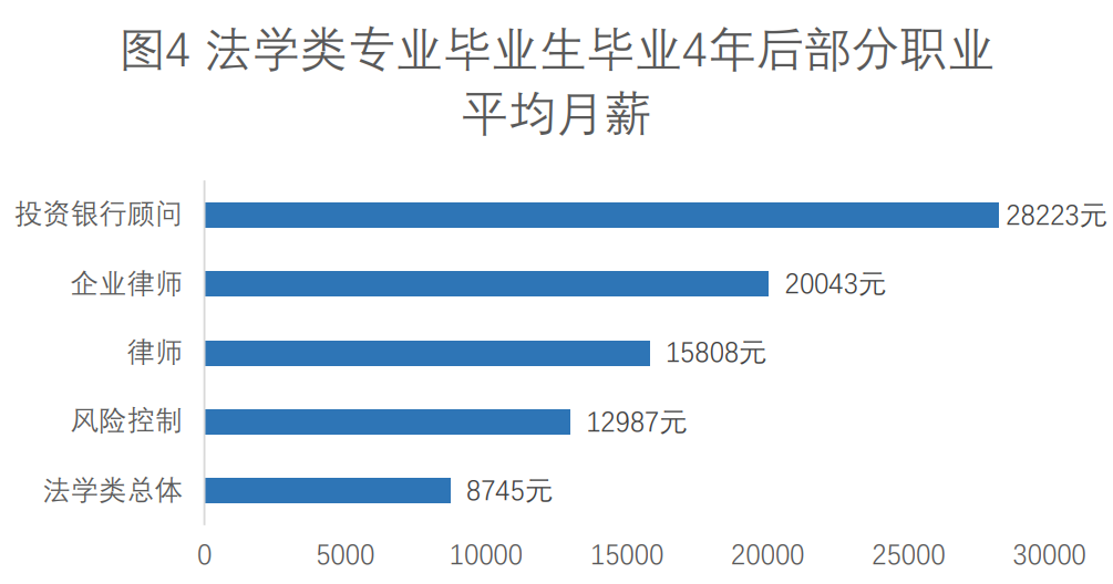 综合法学类人才毕业4年后的就业方向和平均月薪来看(图4所示),在法学类专业毕业生从事的所有职业中,投资银行顾问岗位月收入最高,平均月薪达28223元,紧随其后的是企业律师、律师等;相较于毕业0-3年的职业薪资,毕业4年后法学类人才薪资基本呈现多倍增长的趋势。