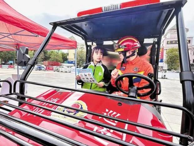10月18日,河北省“双争有我 文明新风汇”群众性精神文明创建活动图片巡展首站在辛集市工人文化宫广场举行。这是消防队员为小朋友讲解消防知识。 记者 张晓超摄