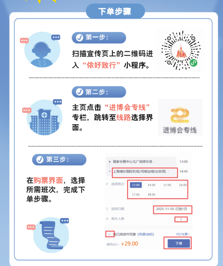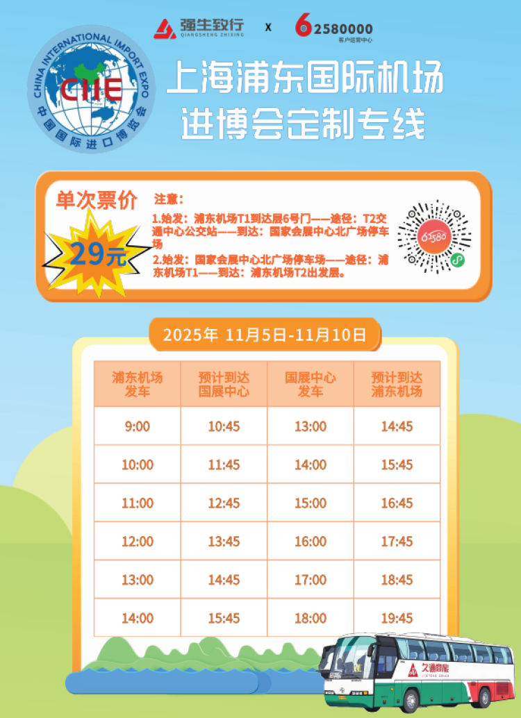 浦东机场进博会保障专线60分钟直达,免换乘,线路串联浦东机场和国家会展中心,全程约60分钟,中途无需换乘,高效便捷。