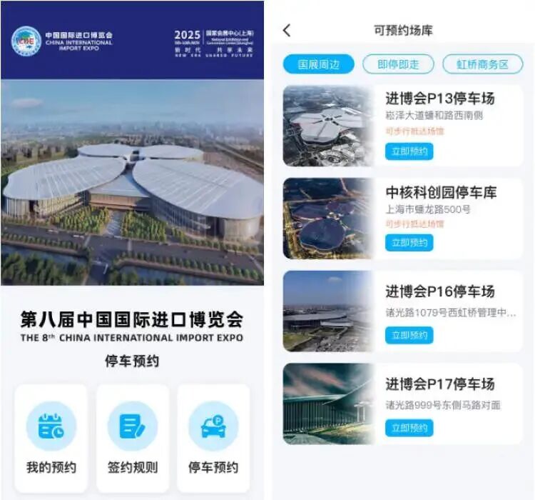 值得一提的是,本届进博会所有预约停车场(库)提供当日预约服务,停车人可提前1小时预约停放,11月1日起,“进博会停车预约系统”正式上线,可通过“上海停车”APP和小程序、“随申行”APP和微信小程序等渠道进行预约。