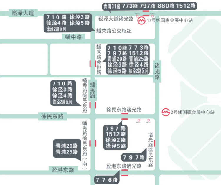 七莘路专线:国展中心P5停车场—9号线中春路站、七宝公交站、12号线七莘路站。