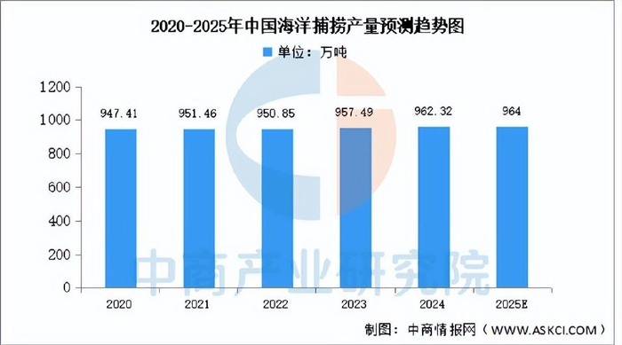 中国捕捞渔业产量连续多年全球第一,并大力建设“海洋牧场”,中国海洋捕捞产量也稳定增长。中商产业研究院发布的《2025-2030年中国海洋渔业深度分析及产业发展风险研究预测报告》显示,2024年中国海洋捕捞产量达962.32万吨,同比增长0.5%。中商产业研究院分析师预测,2025年中国海洋捕捞产量将达964万吨。