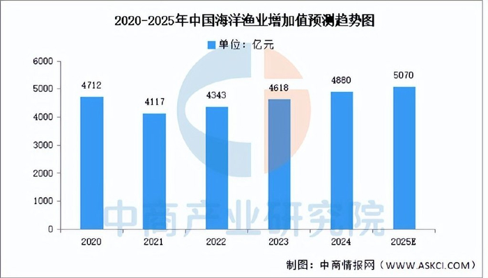 2024年实现增加值4880亿元,比上年增长4.0%。海洋渔业现代化建设加快推进,养捕结构进一步优化,水产种业振兴和深远海养殖促进水产品消费升级,“互联网+设施渔业”助力海水养殖不断向绿色化、智能化转型,海洋水产品稳产保供能力持续提高。中商产业研究院分析师预测,2025年我国海洋渔业将达5070亿元。