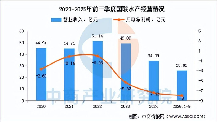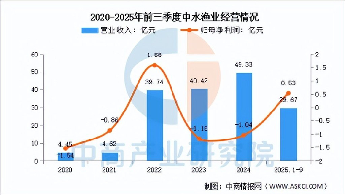 2025年前三季度实现营业收入10.83亿元,同比下降7.12%;归母净利润亏损0.32亿元。2024年主营产品包括水产贸易业、水产加工业、水产养殖业,营收分别占整体的44.01%、37.74%、14.19%。