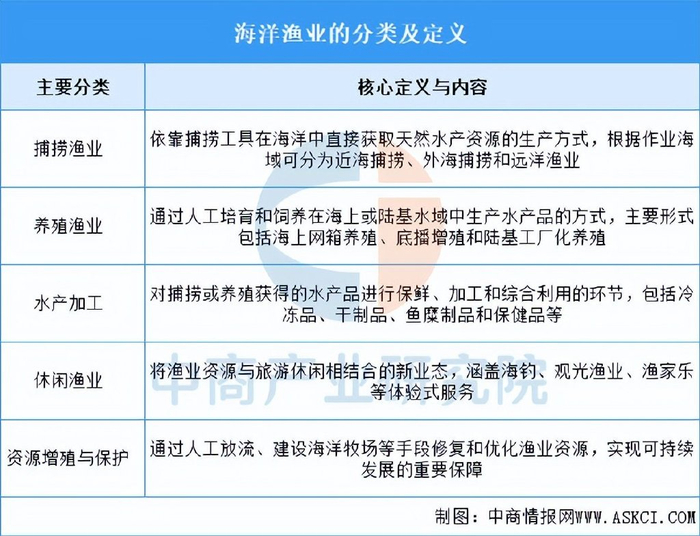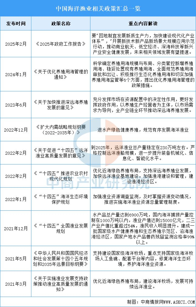 海洋渔业是一个综合性的生产事业,涵盖了捕捞、养殖、加工、物流和销售等多个环节。近年来,海洋渔业受到国家政府大力支持,《关于优化养殖用海管理的通知》《关于加快推进深远海养殖发展的意见》《扩大内需战略规划纲要(2022-2035年)》等政策的发布为海洋渔业的可持续发展提供了有力保障。