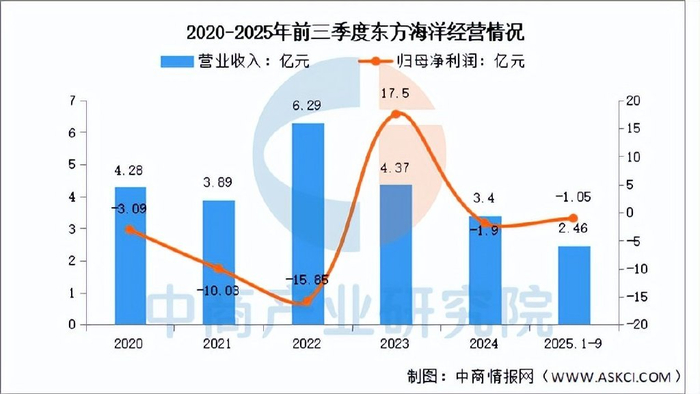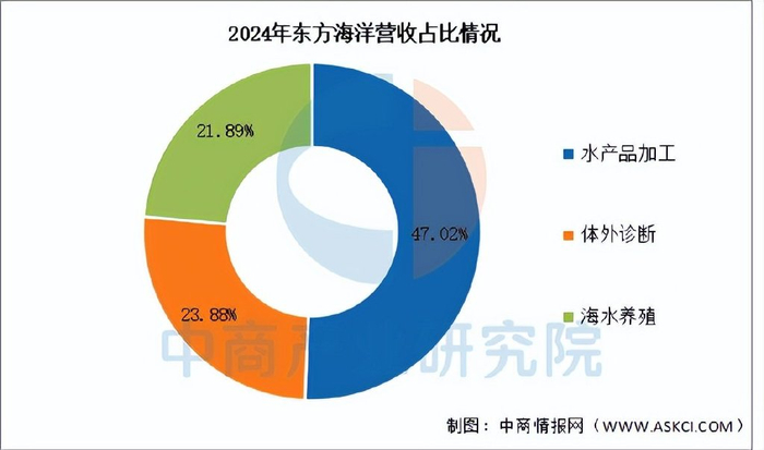 2025年前三季度实现营业收入2.46亿元,同比下降0.81%;归母净利润亏损1.05亿元。2024年主营产品包括水产品加工、体外诊断、海水养殖,营收分别占整体的47.02%、23.88%、21.89%。