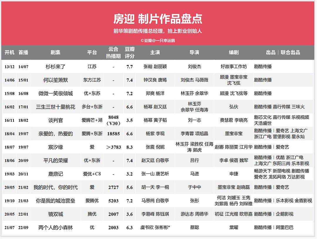 房迎,前华策集团克顿传媒高级副总裁&剧酷传播总经理,自2010年6月加入剧酷传播后,参与制作了《何以笙箫默》《微微一笑很倾城》《三生三世十里桃花》《亲爱的热爱的》等多部现象级爆款。