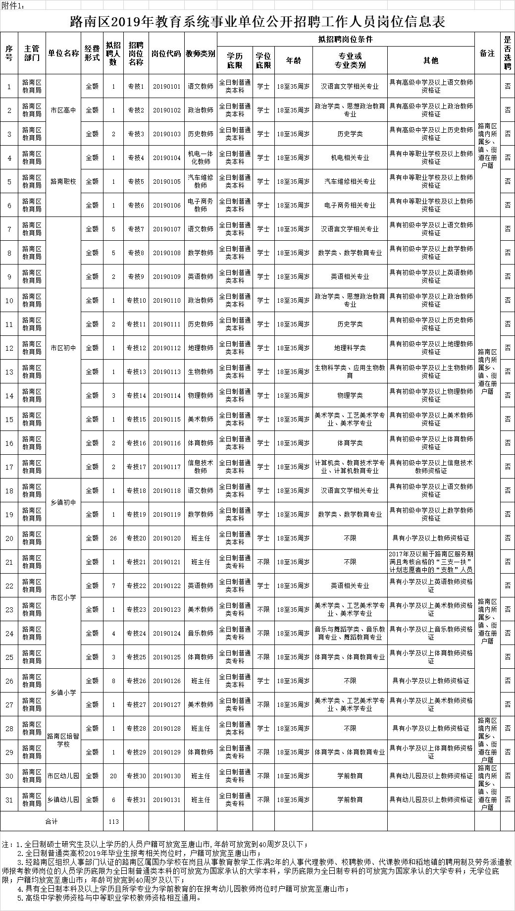 路南区教育系统所属事业单位,共招聘中学(含初中、高中、职校)、小学及幼儿园教师113名。