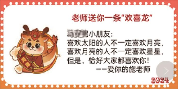 “勇敢龙”“自律龙”“发光龙”……这些自带萌感的龙年专属称号出自郭里园小学一(2)班班主任施真真之手。龙年将至,她为全班49名学生每人定制了一首以“老师送你一条××龙”为题的“三行情诗”,并配上活泼的卡通龙形象和喜庆的花边,有趣又有爱。